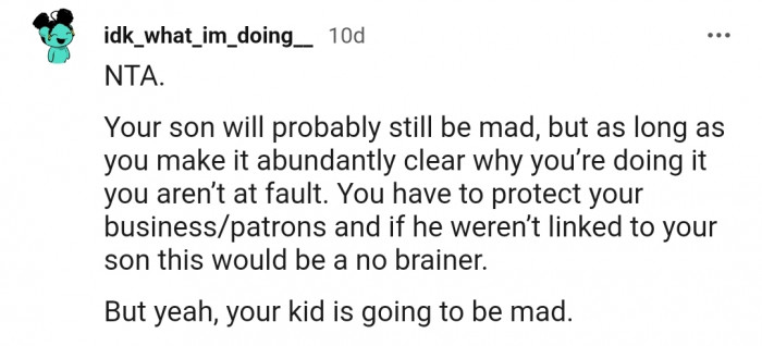"Your son will probably still be mad, but as long as you make it abundantly clear why you’re doing it, you aren’t at fault."