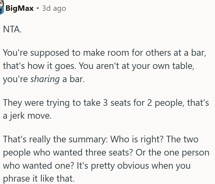 The woman’s date eventually swapped seats with her but deliberately sat wide, encroaching on OP’s space. Despite this, OP remained calm, ordered food, and carried on. When nearby seats opened up later, OP moved over to create more room.