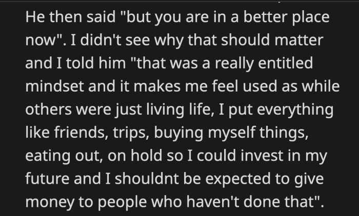 u/wendiasterOP doesn't think that's a good way to look at things. She said she was once in their position, so she doesn't see why she should carelessly spend her hard-earned money.