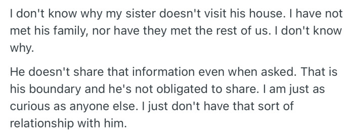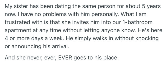 Her sister treats the place like he can come and go freely, while OP is stuck planning her bathroom breaks like it’s a schedule conflict.