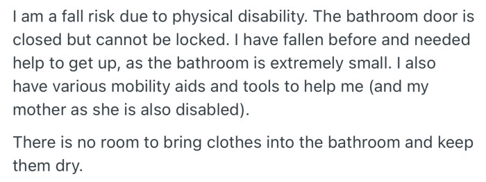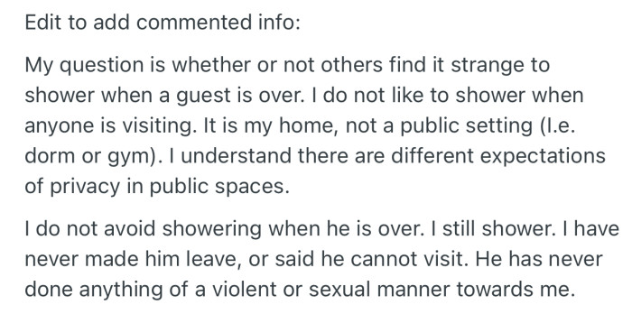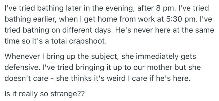 The Reddit comments zero in on the same tension, why OP can’t bathe when he’s there, even though everyone else keeps acting like it’s no big deal.