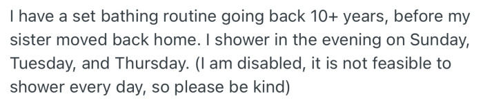 Her bathing routine of over 10 years has been disrupted due to her sister’s boyfriend always coming over.