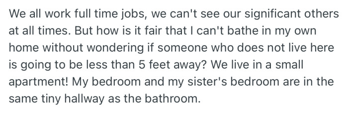 Her sister treats it like her partner can come and go freely. She just wants to be able to shower without worrying about who might be right outside the door.