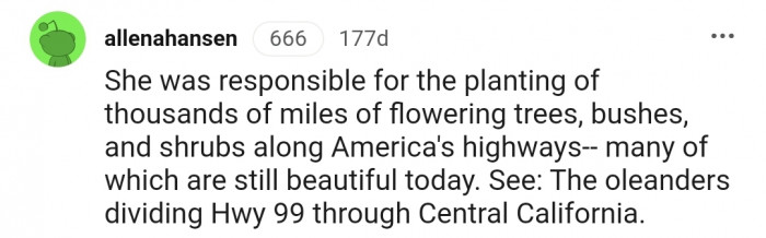 "She was responsible for the planting of thousands of miles of flowering trees, bushes, and shrubs along America's highways"