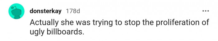 "She was trying to stop the proliferation of ugly billboards."