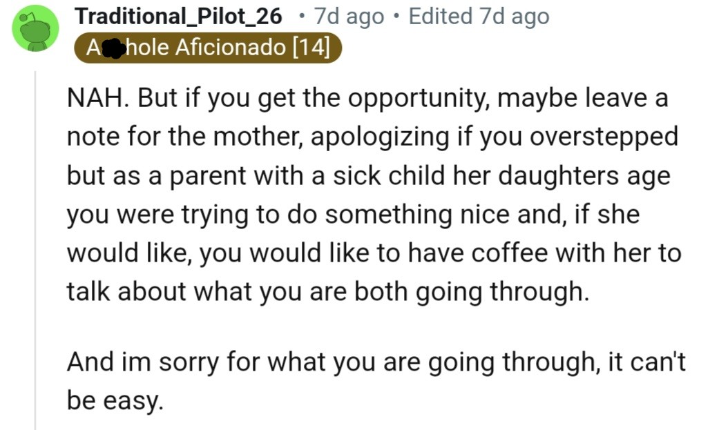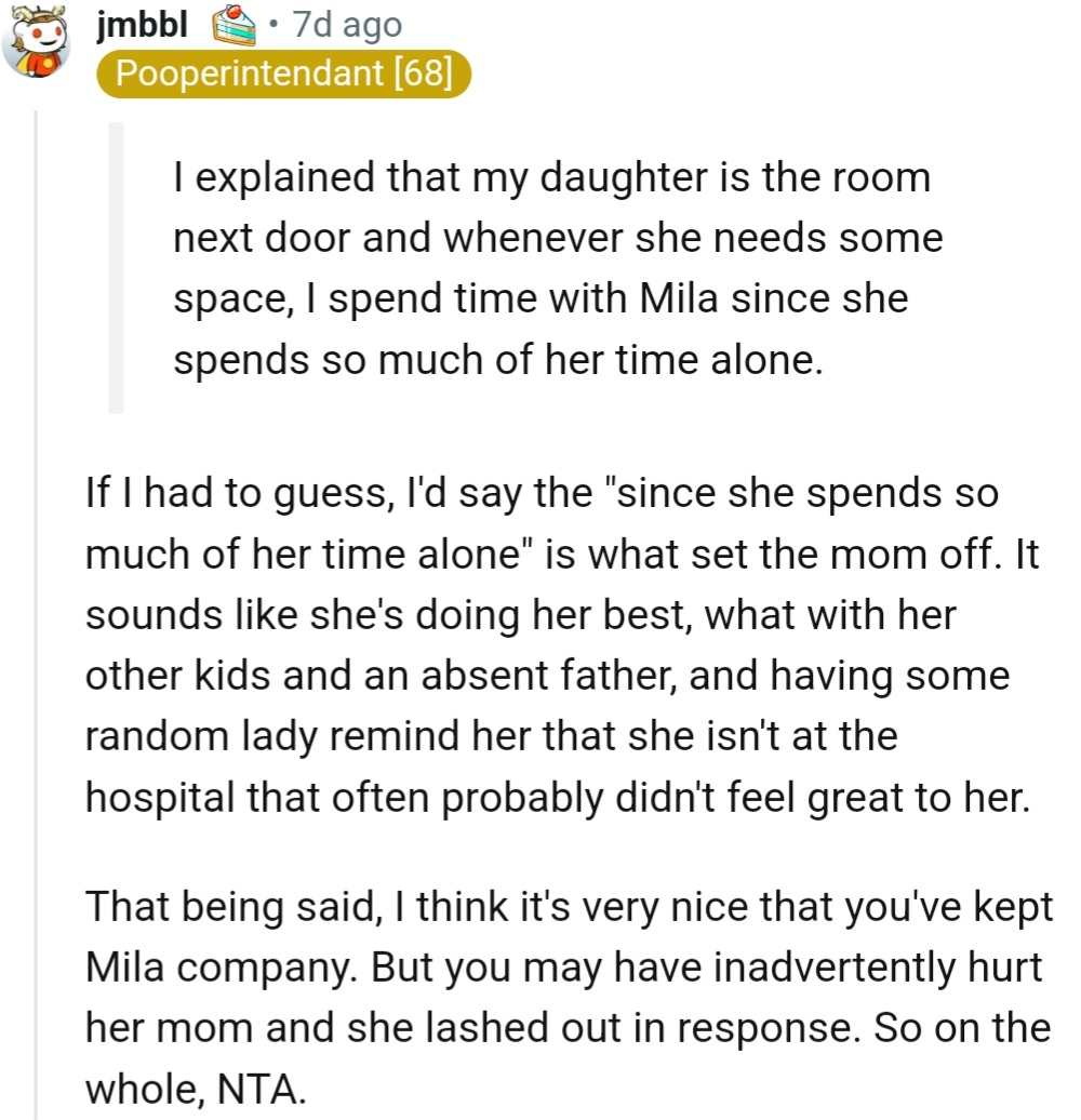 Redditors praised OP for her kindness and agreed that Mila’s mom overreacted. They speculated that her anger might stem from worry and guilt about being unable to visit more often, given her many responsibilities.
