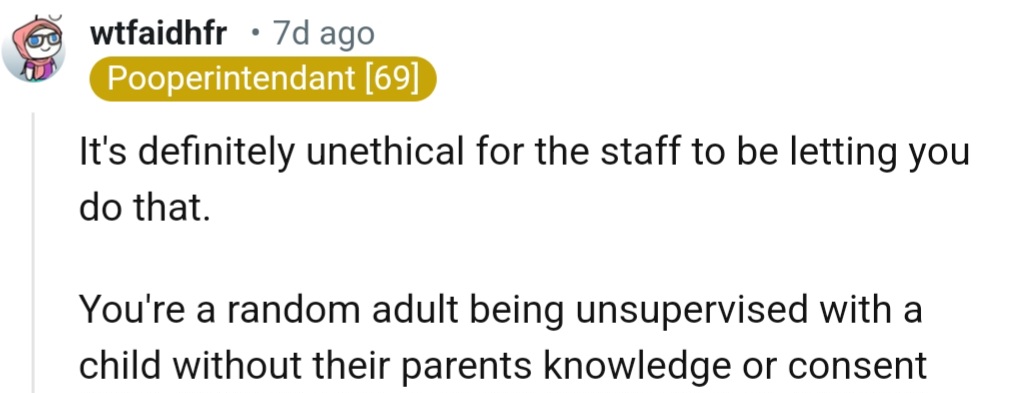 "You're a random adult being unsupervised with a child without their parent's knowledge or consent"