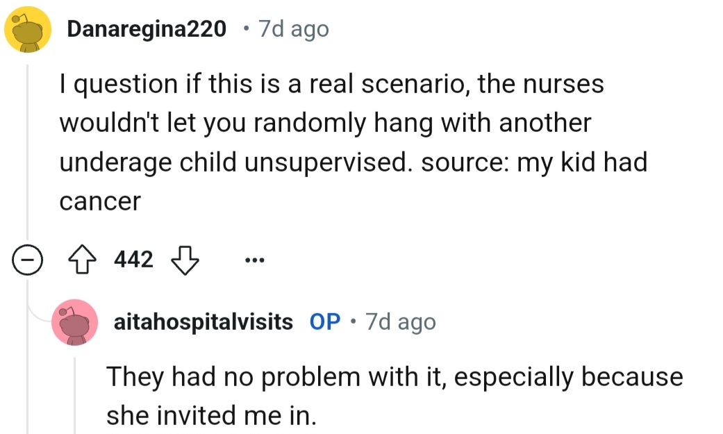 "The nurses wouldn't let you randomly hang with another underage child unsupervised"