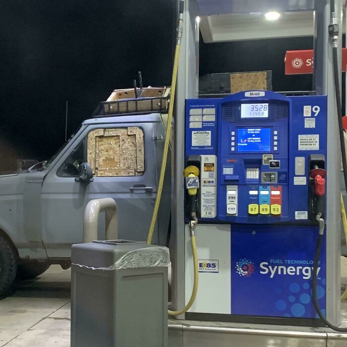 "All Windows Were Boarded Up Like This Except For The Windshield"