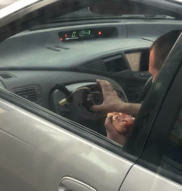 "Guy Drives With No Steering Wheel While Eating Pizza"