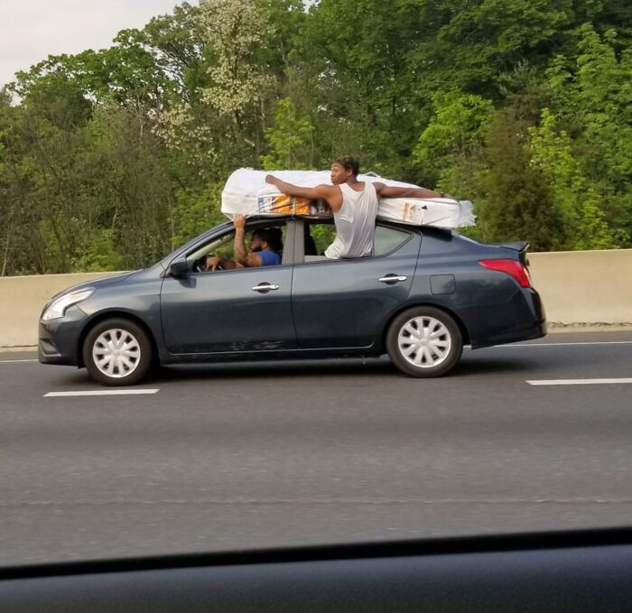 "Since The Theme Seems To Be Mattresses On Cars, Here's One I Caught A Little While Ago. We Were Going 65+ MPH On 695"