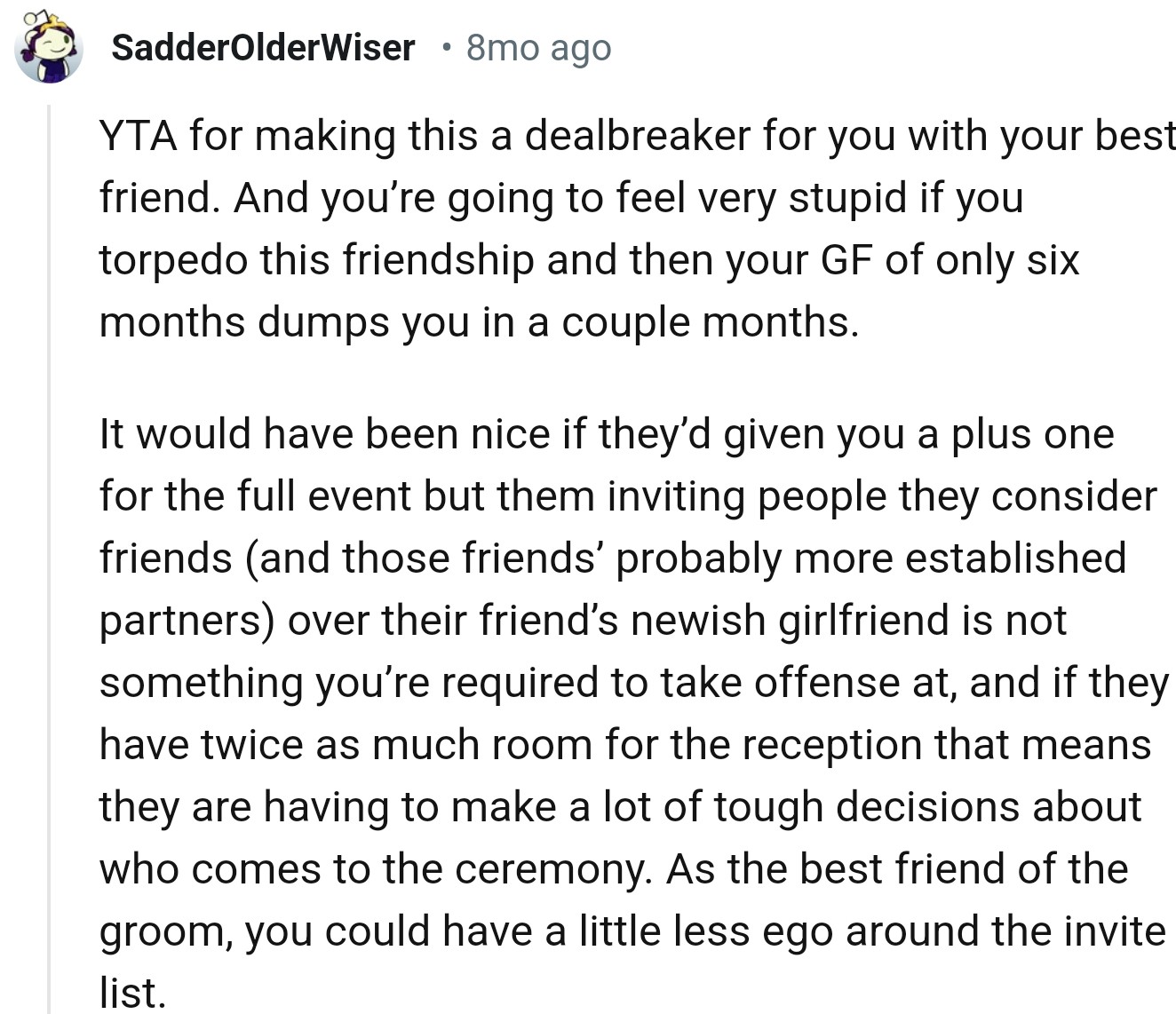 It was no secret that the bride was wary of new people, and OP’s girlfriend was rarely invited to social gatherings at their house as a result. It was worth noting that when OP’s friend first started dating her, OP made sure she was included in everything right from the start.