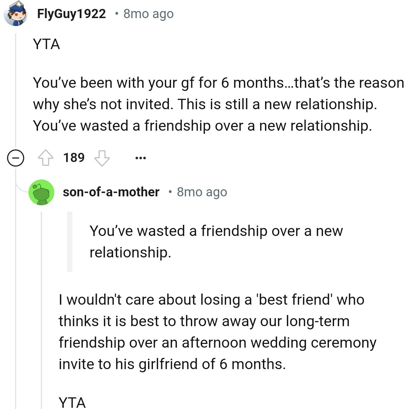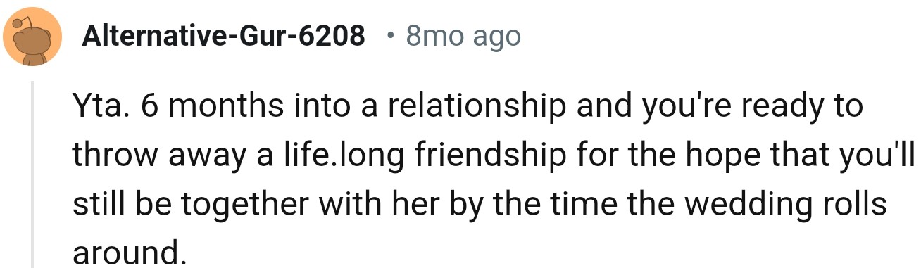 "6 months into a relationship and you're ready to throw away a lifelong friendship"