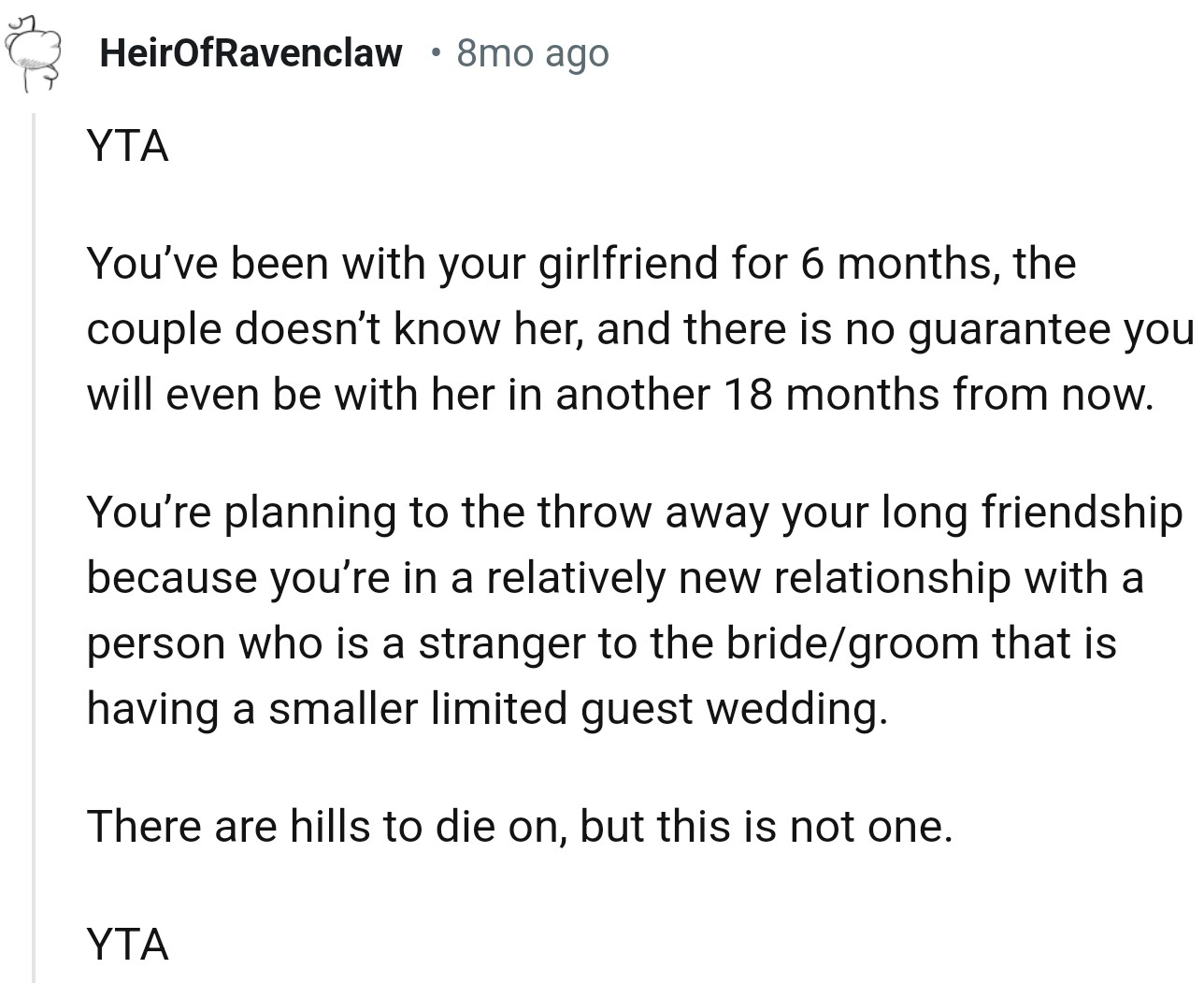 Redditors were pretty shocked that OP was willing to risk a lifelong friendship over a six-month relationship. They deemed him the a**hole for blowing things out of proportion.