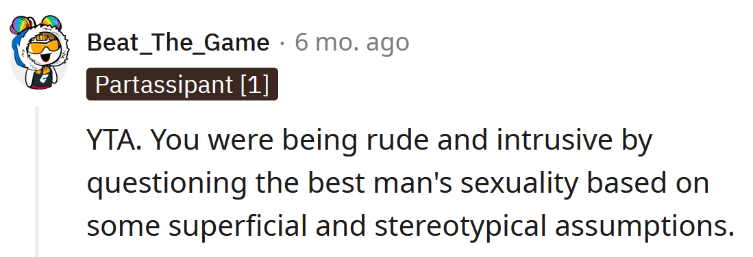 What are your thoughts on this situation? Do you think the OP was out of line for questioning the best man's sexuality, or was she asking an innocent question out of curiosity?