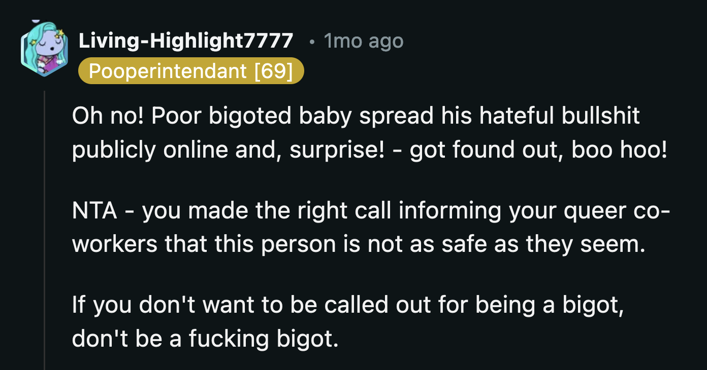 Reddit userTheir queer coworkers thanked OP for giving them a heads-up. G did not appreciate OP's proactive actions.