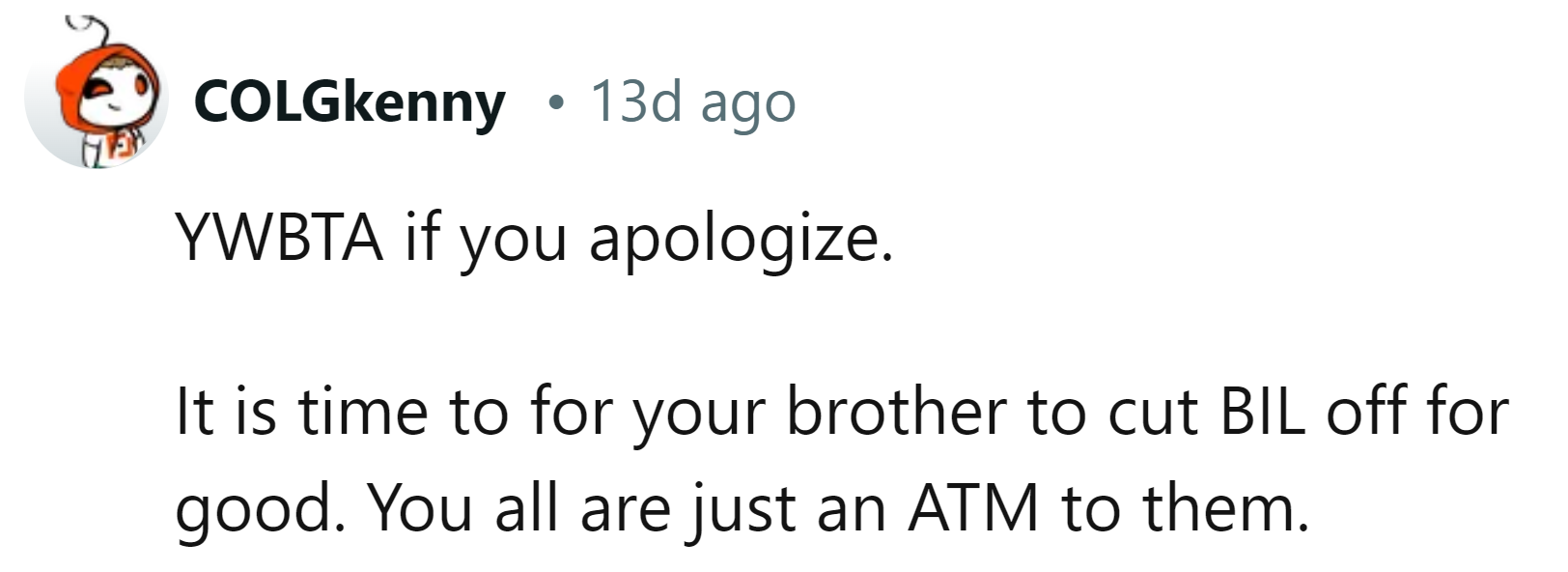 The Redditor says her BIL and his fiancée have used her and her husband for financial help in the past and have even stolen from them.