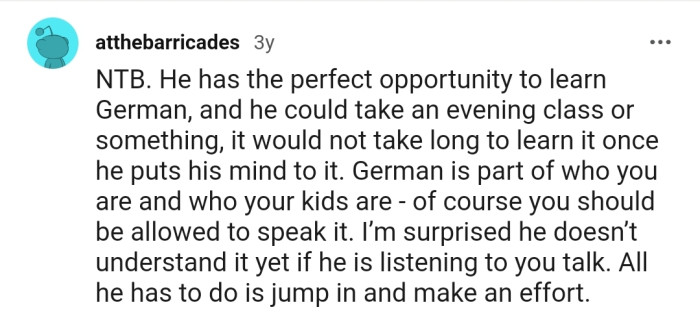 Her husband, despite her insistence, remains firmly rooted in his English-speaking comfort zone, displaying little progress in learning German over the past 16 years. His tepid interest in the language is not for lack of encouragement but rather an underestimation of its value, a perspective OP finds hard to understand.