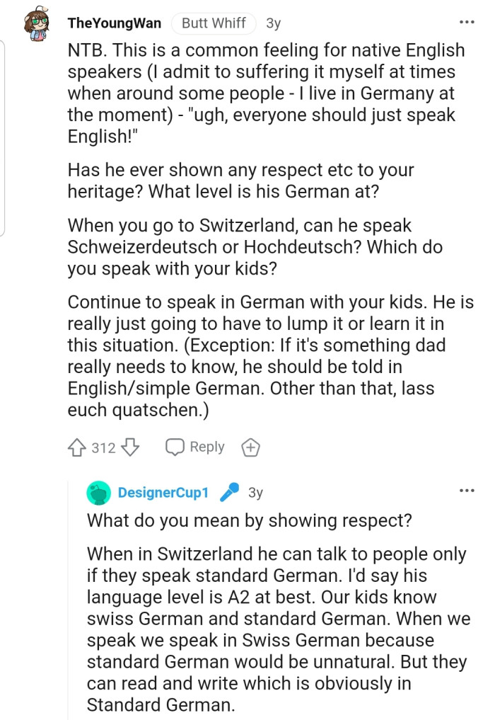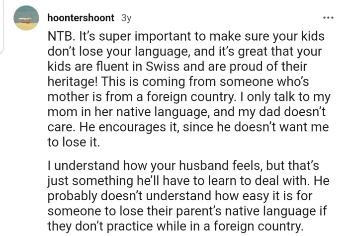 Determined to maintain a connection with her heritage, OP has made a concerted effort to raise their children as bilingual speakers. This decision, approved by her husband, aims not only to allow the children to communicate with their Swiss relatives but also to cultivate an appreciation for their dual heritage.