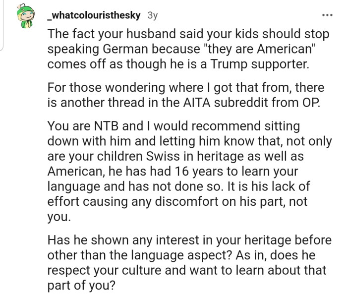"The Fact Your Husband Said Your Kids Should Stop Speaking German Because 'They Are American' Comes Off as Though He Is a Trump Supporter."