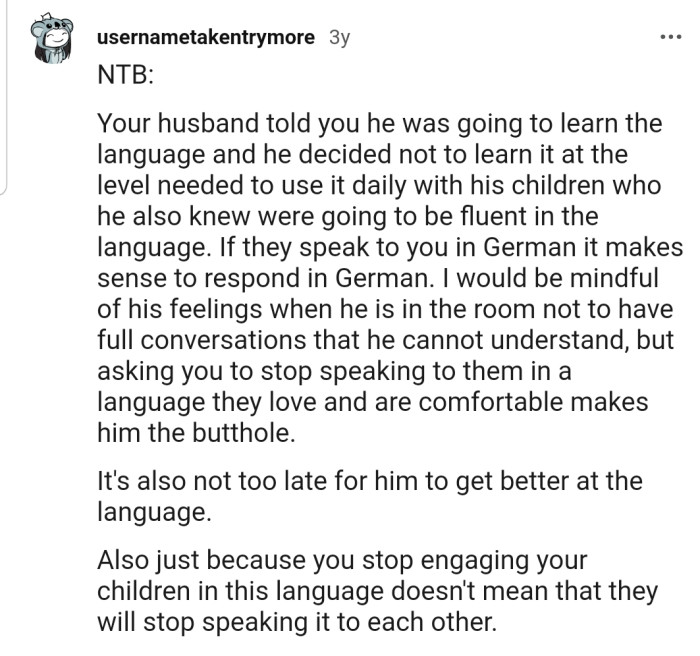 Reddit.comOP Raised Their Kids to Be Bilingual, and Now Her Husband Feels Left Out Each Time She and the Kids Discuss in German