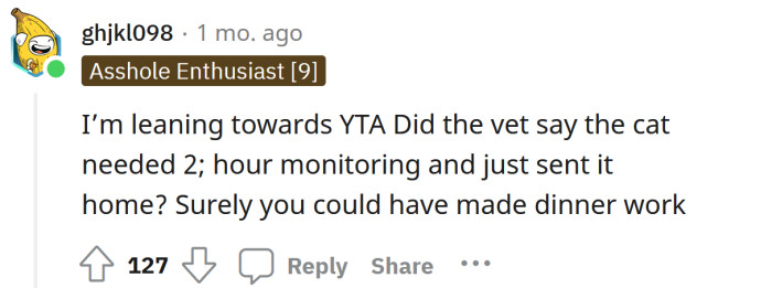 This situation demonstrates the complexities of emotional prioritization in relationships. The Redditor's choice to stay home with her sick cat reflects a deep emotional bond that can sometimes lead to conflict with social obligations, highlighting the need for open communication about values and priorities.