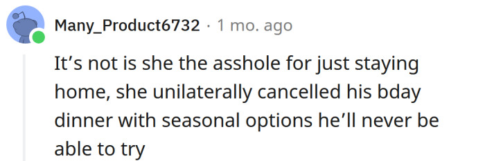 "She unilaterally canceled his birthday dinner with seasonal options he'll never be able to try."