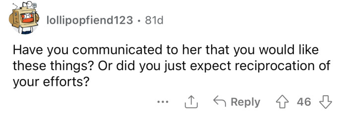 Encouraging the Redditor to express their feelings more openly could lead to a better understanding of each other's expectations and desires.