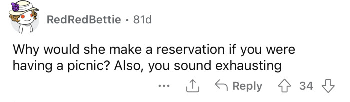 Reddit/KeepItFresh2367881They had planned to go on a picnic if the weather was nice, but it turned out to be raining that day, so they went out for dinner instead.