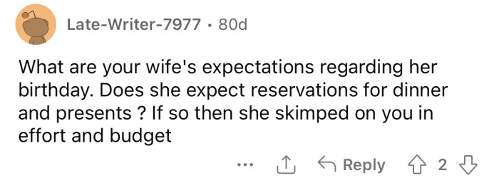 The OP explained that he felt disappointed with his wife's level of effort for his recent birthday.