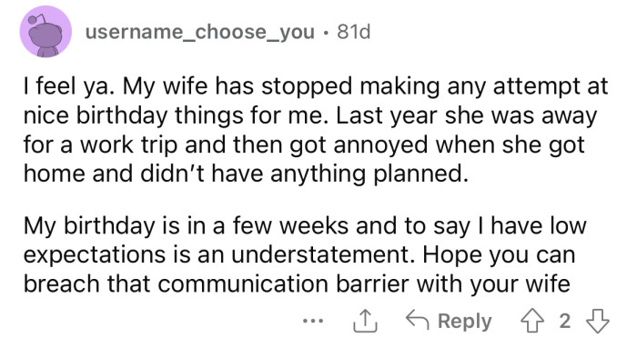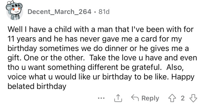 The Redditor's disappointment seems to stem from unmet expectations and a perceived imbalance in effort put into celebrating birthdays. It highlights how crucial communication is in relationships, as it helps align expectations. His self-doubt about being too sensitive could indicate a need for reassurance or validation, which can be addressed through open conversations.