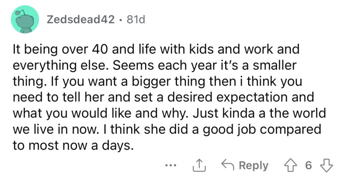 OP expected more because he did all of those things for his wife's birthday. In a later edit, he agreed with the Reddit community that he needed to communicate what he wanted better.