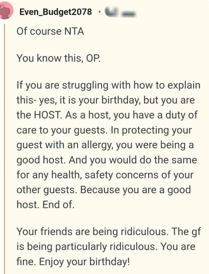 One shouldn't be scared to discuss the risks associated with allergies because when excluded, the results could be fatal. Redditors praised the OP for being a good frien,d and she was declared not the AH.