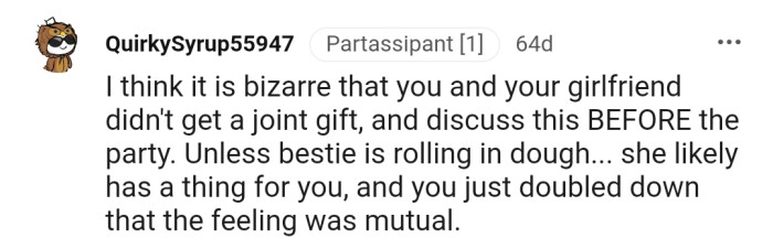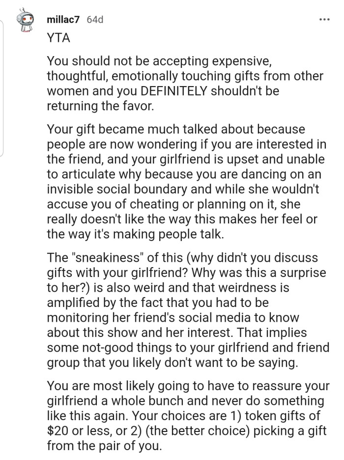 This is a very tricky matter for the Reddit community to judge. While some people admit that getting the friend an expensive gift is not wrong, everyone seems to agree that he should have spoken to his girlfriend about it first.
