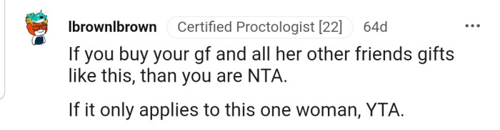 "If you buy your girlfriend and all her other friends gifts like this, then you are NTA."