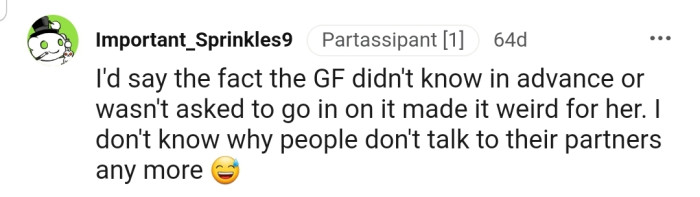 "The fact that the girlfriend didn't know in advance or wasn't asked to go in on it made it weird for her."