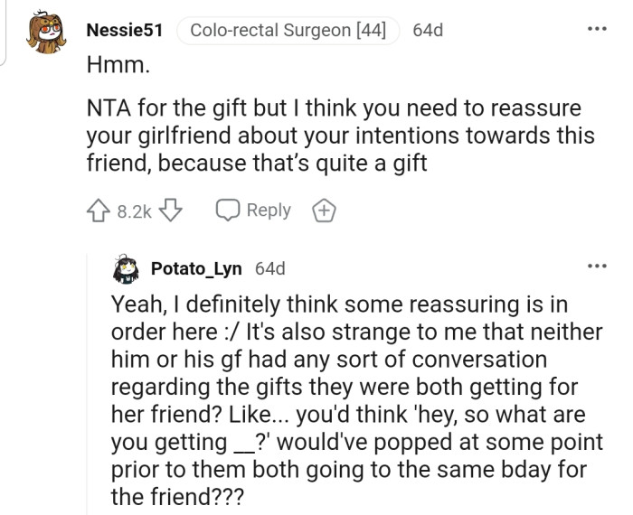 Some commenters have also suggested that a joint gift would have been a safer option. Regardless, OP has been advised to reassure his girlfriend and ensure that he communicates better in the future.