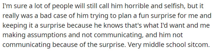 "It really was a bad case of him trying to plan a fun surprise for me while keeping it a surprise."