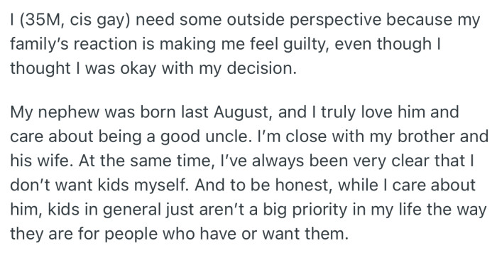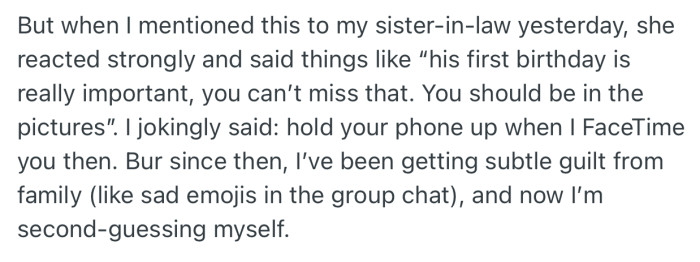 For his brother and SIL, that day is loaded. Everything they went through to have that child sits behind it. So when he skips the party, it doesn’t feel like “just a date conflict” to them. It feels like he’s not fully showing up for something they see as huge.
