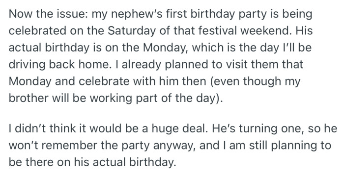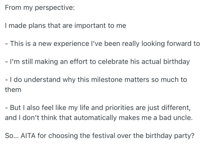 On one side, the baby’s parents, the brother and SIL, see that first birthday as more than cake and photos. It’s the emotional payoff after everything they went through to get there. On the other side, the uncle isn’t ditching the baby entirely, he’s choosing a different “important” moment that he feels he can’t just walk away from.