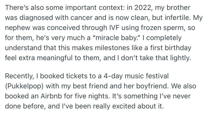 Once the brother and SIL realize he’s trading their heavy first-birthday moment for a festival, the conflict stops feeling petty and starts feeling personal.