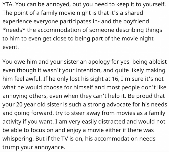 During a family movie night, she lashed out at her younger sister for explaining the movie scenes to her blind boyfriend, "because even though they were whispering, I could still hear them, and it disturbed my immersion."