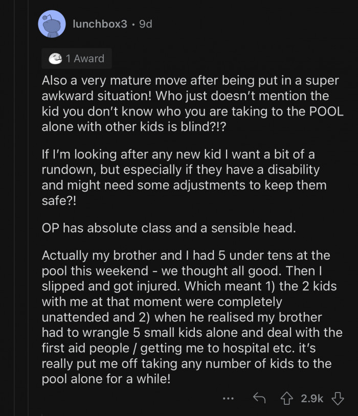 Reddit: r/AmItheA**holeThe second OP realized the kid was blind, she started getting nervous.