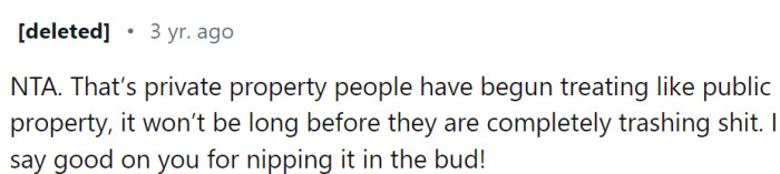 Respecting private property isn't a nicety; it's a basic norm of any community. The neighbors learned a hard lesson about overstepping boundaries and taking things for granted.