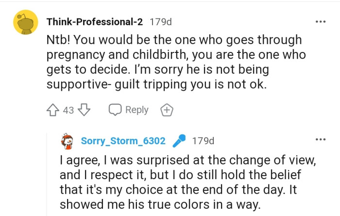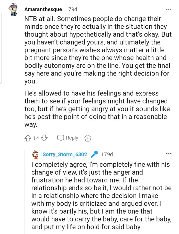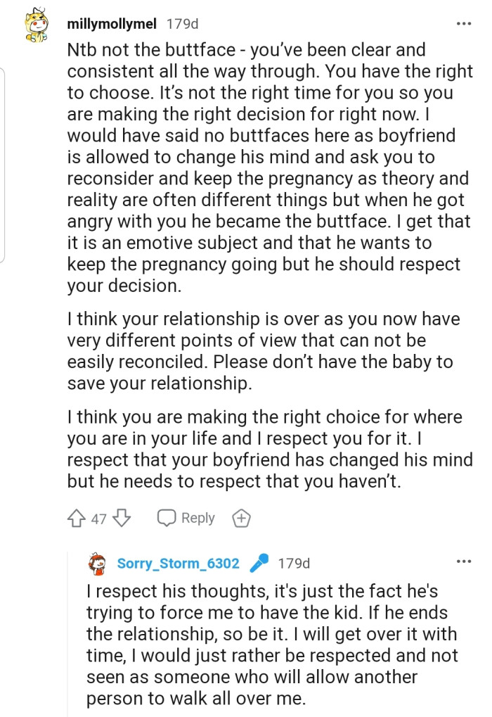 Reddit.comOP got pregnant for her boyfriend. And while they previously agreed to abort any accidental pregnancy, it seems he now has a different view and would like to raise a family with her.