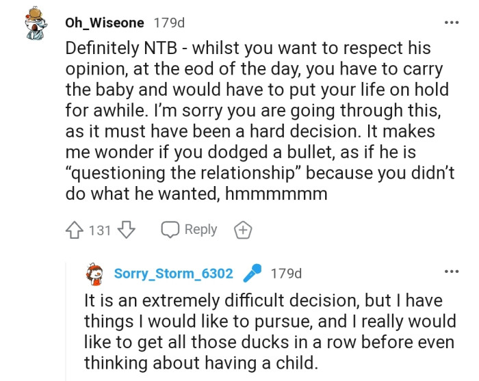 "While you want to respect his opinion, at the end of the day, you have to carry the baby and would have to put your life on hold for a while."