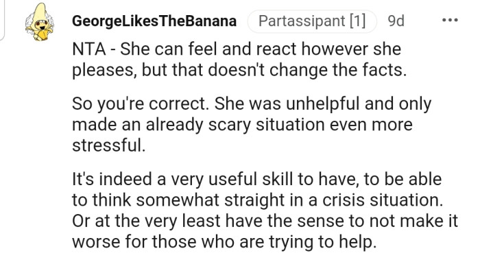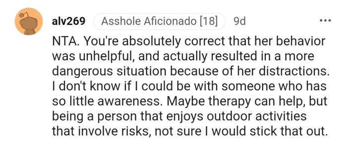 "You're absolutely correct that her behavior was unhelpful and actually resulted in a more dangerous situation because of her distractions."