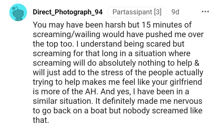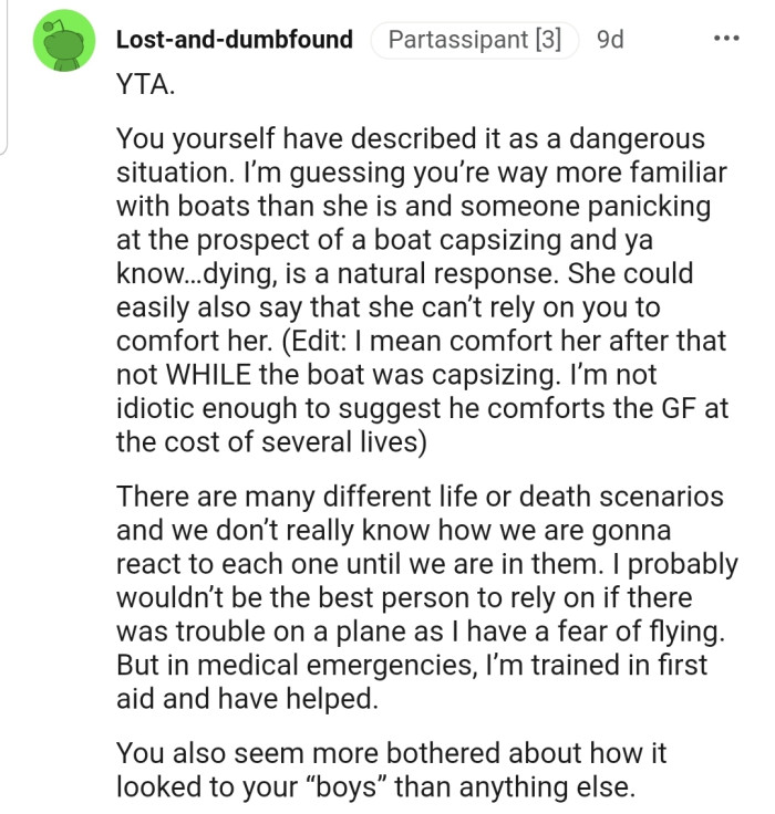 Other commenters also had an issue with OP’s explanation that only men tried to keep the boat from capsizing, but he clarified that it wasn’t a case of gender discrimination.