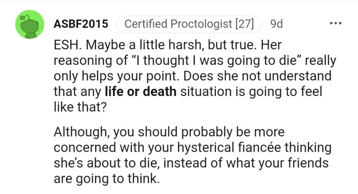On their way home, OP told his fiancée that she had proven that he couldn’t rely on her in life-or-death situations. This upset her greatly, leading OP to ask the critical AITA question.
