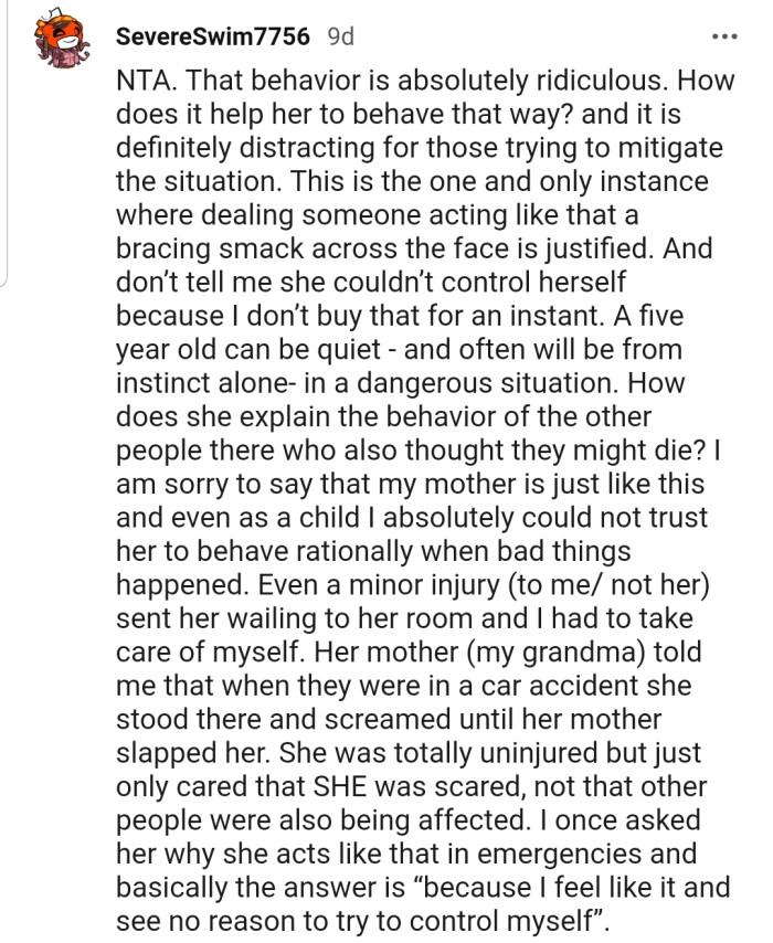 "ESH. Maybe a little harsh, but true. Her reasoning of 'I thought I was going to die' really only helps your point."